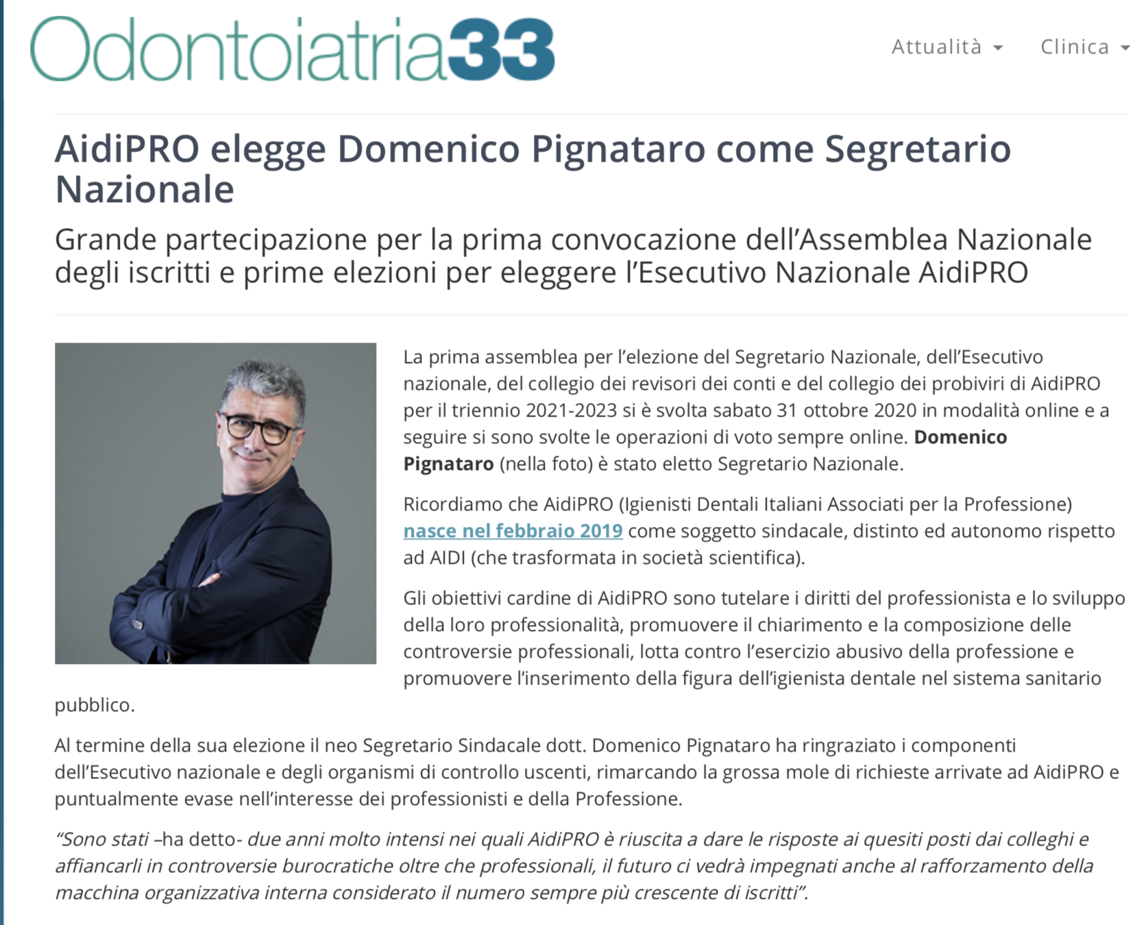 Il 21 luglio 2012 il Dott. Pignataro é stato eletto Presidente regionale di AIDI, ( associazione italiana igienisti dentali italiani.